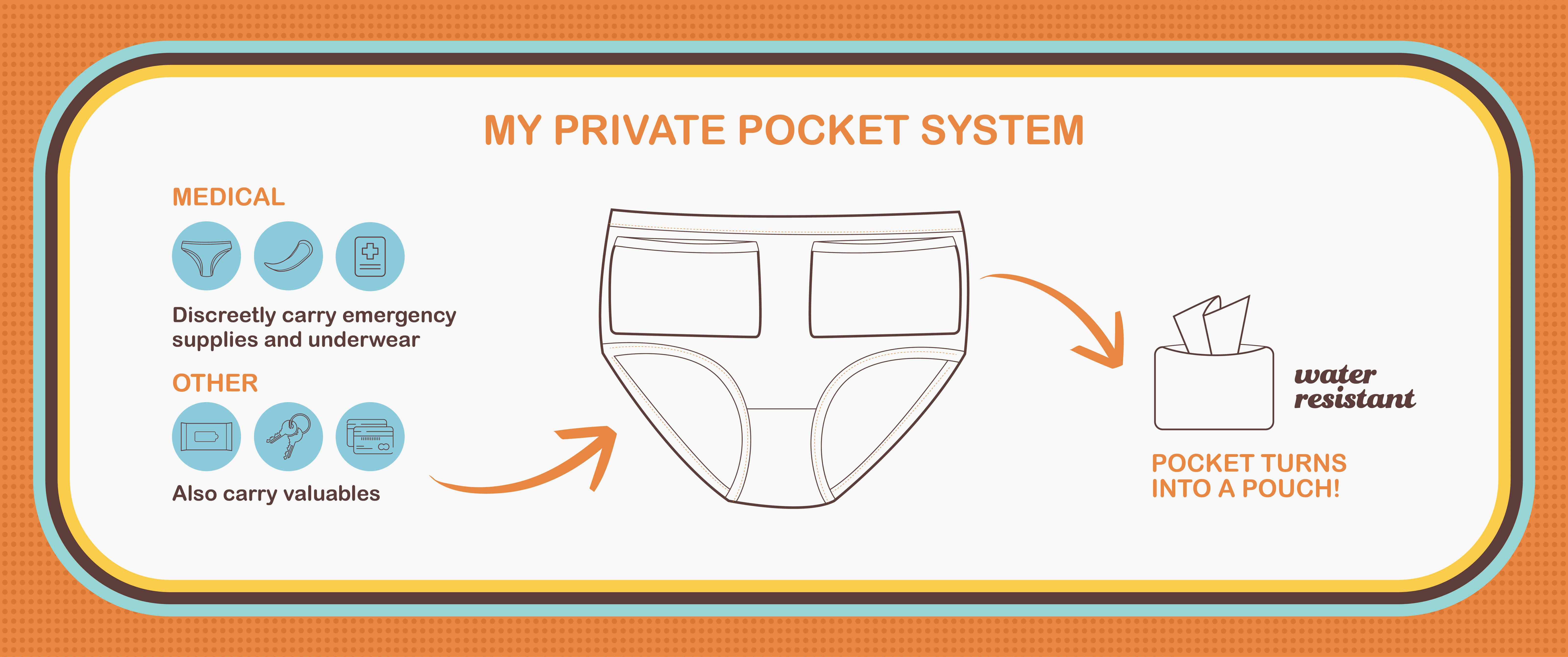 These undies can save the day! Our underwear is designed with discretion in mind and is made especially for children with incontinence. Our patent-pending underwear has hidden pockets to carry emergency supplies and backup underwear.